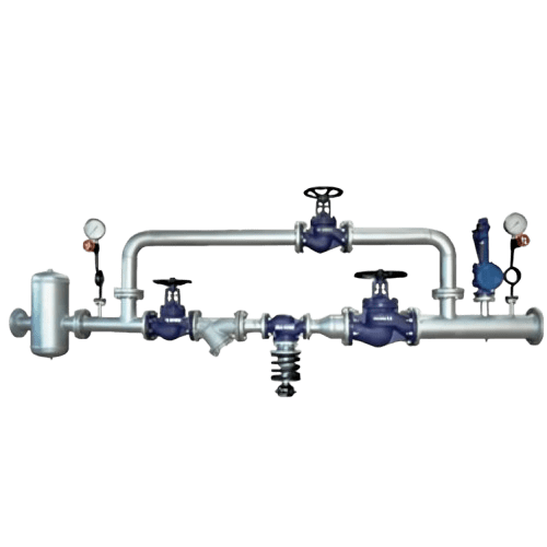Packaged PRV skids that step boiler pressure down to process utilization pressure. Includes pilot-operated PRV, strainer, safety valve, gauges, and isolation valves.